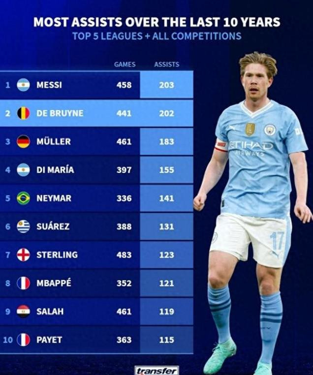 虽然,德布劳内超越梅西的助攻数只是时间上的问题,但是对助攻数榜单长达10年的垄断,足以证明梅西的才华横溢,要知道梅西离开五大联赛已经很久了,假如梅西继续在欧洲足坛停留,想必没有人能够完成对梅西的超越。